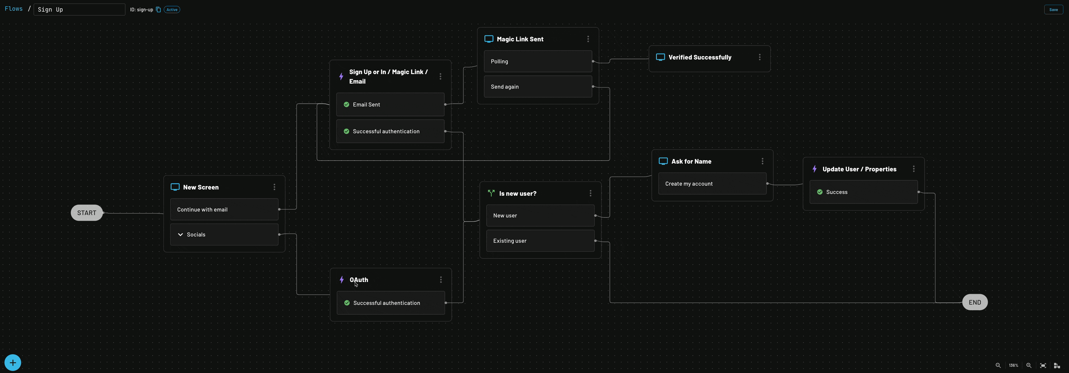 The day we emerged from stealth gave us proof of this value. Halfway though launch day, we realized we didn’t really need to ask new users for their names if they use OAuth (Google or GitHub) to sign up. Their name is within the scopes required by OAuth and we get it as soon as they sign up. It took us 2 minutes to edit the Flow – we disconnected the OAuth action from the New User condition, and reconnected it to the end. Done.